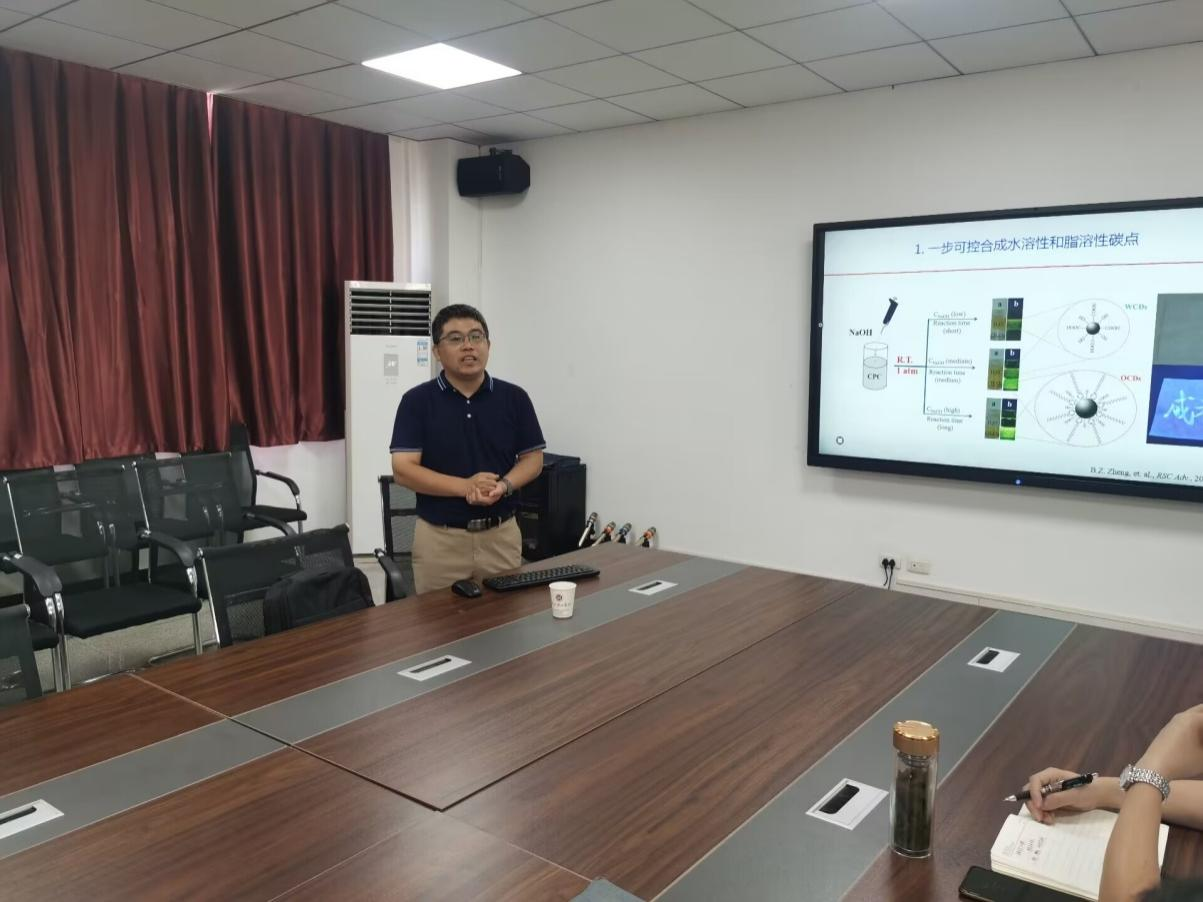 郑保战教授主要围绕疏水性碳量子点的绿色大规模可控制备与荧光应用、两亲性碳量子点的制备与其污染物检测及水处理应用进行了详细报告,深入浅出地介绍了其研究团队针对航空、食品等行业的特定需求进行的疏水性、两亲性碳量子点的研发和应用。报告内容涉及化学、材料、环境等多学科内容,对开拓到场师生的知识边界、启迪研究思路很有帮助。到场师生结合各自的研究课题与郑教授进行了热烈的讨论交流。(通讯员:汪东亮)