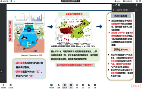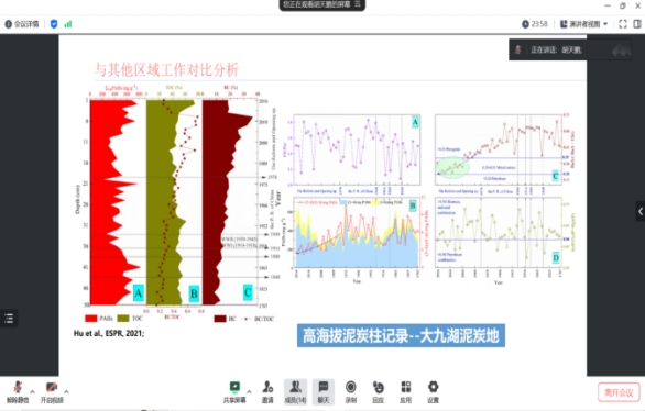 胡天鹏博士首先以《鄂东地区黑碳及多环芳烃湖泊沉积记录及其对人类活动响应》为题进行进站汇报,报告以湖泊沉积柱为载体,通过黑碳及多环芳烃的沉积历史、来源重建、经济社会代用指标之间关系三个方面的研究,全面揭示矿区湖泊污染历史及人为活动影响机制,从而为矿区湖泊水污染治理提供基础数据,为水域污染防治措施的出台提供科学借鉴。