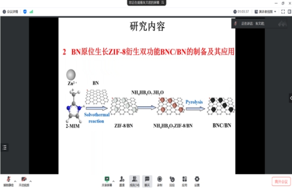 朱文君博士以《MOFs衍生碳基材料及其降解抗生素污染物的研究》为题进行进站汇报,报告以金属有机骨架(metalorganicframeworks,MOFs)为模板,在惰性气体氛围下高温煅烧得到杂原子掺杂多孔碳催化剂;通过改变功能性配体、载体以及碳化条件等调控多孔碳的缺陷结构、杂原子类型以及碳原子环境等,有利于增强多孔碳与目标污染之间的π-π作用、氢键作用以及静电作用等,提高其吸附能力。另一方面,向模板中引入载体有效减少高温处理过程中活性位点的团聚,提高复合材料催化能力,并同时研究了该体系吸附-催化反应机理与材料组成和结构之间的构效关系。