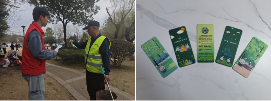 值得一提的是,活动特别融入环保创意元素。志愿者们将学院吉祥物“江童”形象与环保理念结合,利用AI绘画制作了精美且可降解的种子纸书签赠予环卫工人。书签内含植物种子,埋入土壤后可发芽生长,寓意环保事业生生不息。参与活动的志愿者张文坤表示:“这份小小的礼物既是对环卫工作者辛勤付出的感谢,也寄托着对绿色志愿活动的温暖传递。”