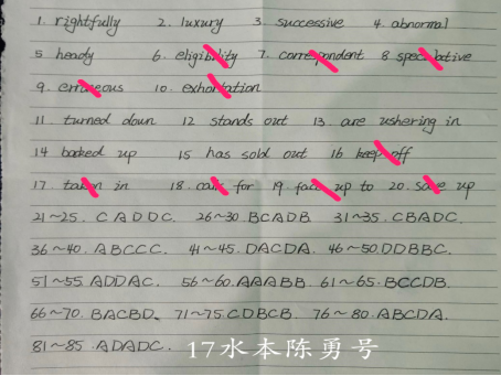 此次活动是疫情防控期间开展的一次对同学们英语能力测试的一场比赛。下午2点半,竞赛准时在线上进行。在竞赛开始时负责人以文件的形式将试题发送至群里,各位参赛同学在规定的时间里按照要求在线上答题。本次竞赛虽无人监考,但每位参赛人员都自觉遵守竞赛纪律,在争取取得好成绩的同时,也将这次竞赛作为提升自己英语水平的一次机会。答题完成后,参赛同学将自己的答题卡完整、清晰的拍照发送至竞赛活动群中,最后由学习部成员评选出十名成绩优异的同学。至此,“英语竞赛”圆满结束。