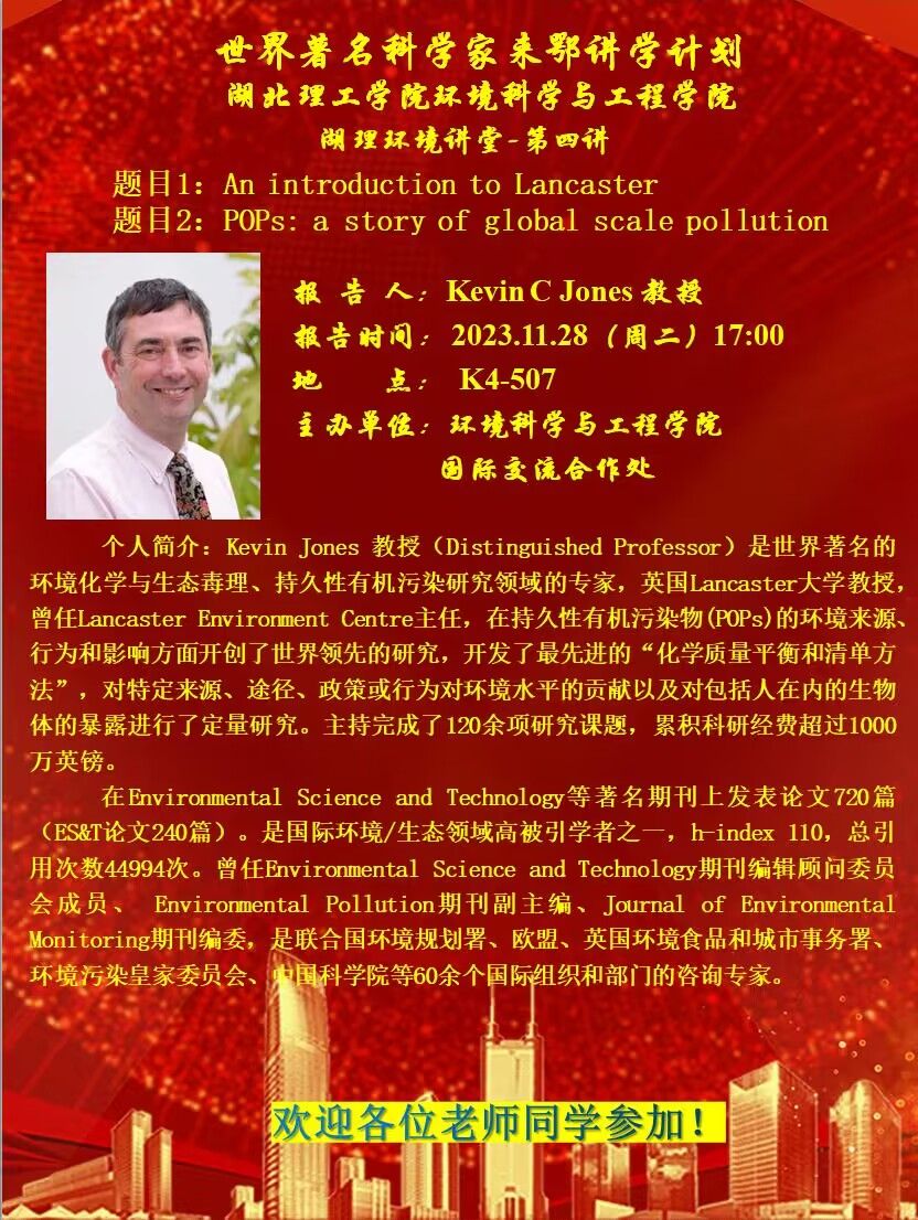 世界著名科学家来鄂讲学-Kevin C Jones教授学术报告通知