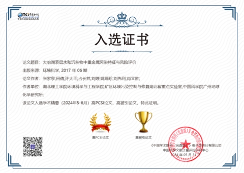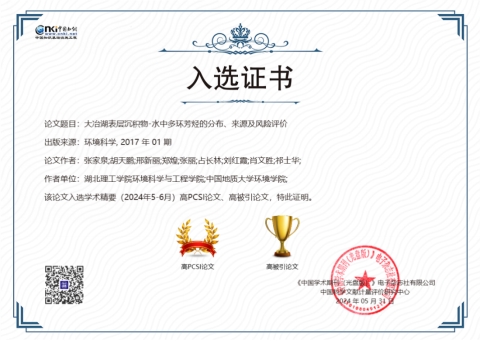 2012年以来,张家泉教授团队持续开展大冶湖流域水体及沉积物中毒害污染物环境行为及其效应研究,探讨工矿活动对其空间分布和赋存影响,评估其对于人体及生态系统的潜在风险,上述研究成果分别于2017年1月和6月发表于《环境科学》,可为大冶湖流域环境综合治理提供科学指导。此次2篇高影响力论文的成功入选,标志着我校在环境工程本科生人才培养、硕士研究生培养等方面取得显著成效,突显了我校环境学科在污染物环境行为及评价领域的研究水平和影响力。
